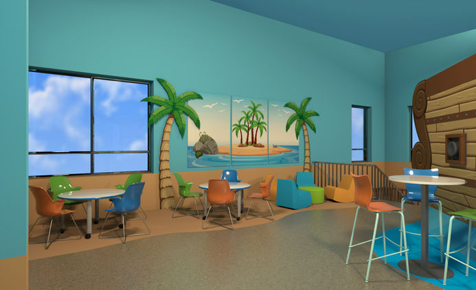 My role included concept art, 3D modeling and rendering, graphics, and production art for the elements throughout the space. The lab features a large pirate ship centerpiece, themed mascot flag, palm tree foliage, a slide, wall art, tiki awning, and interior slatwall panels.